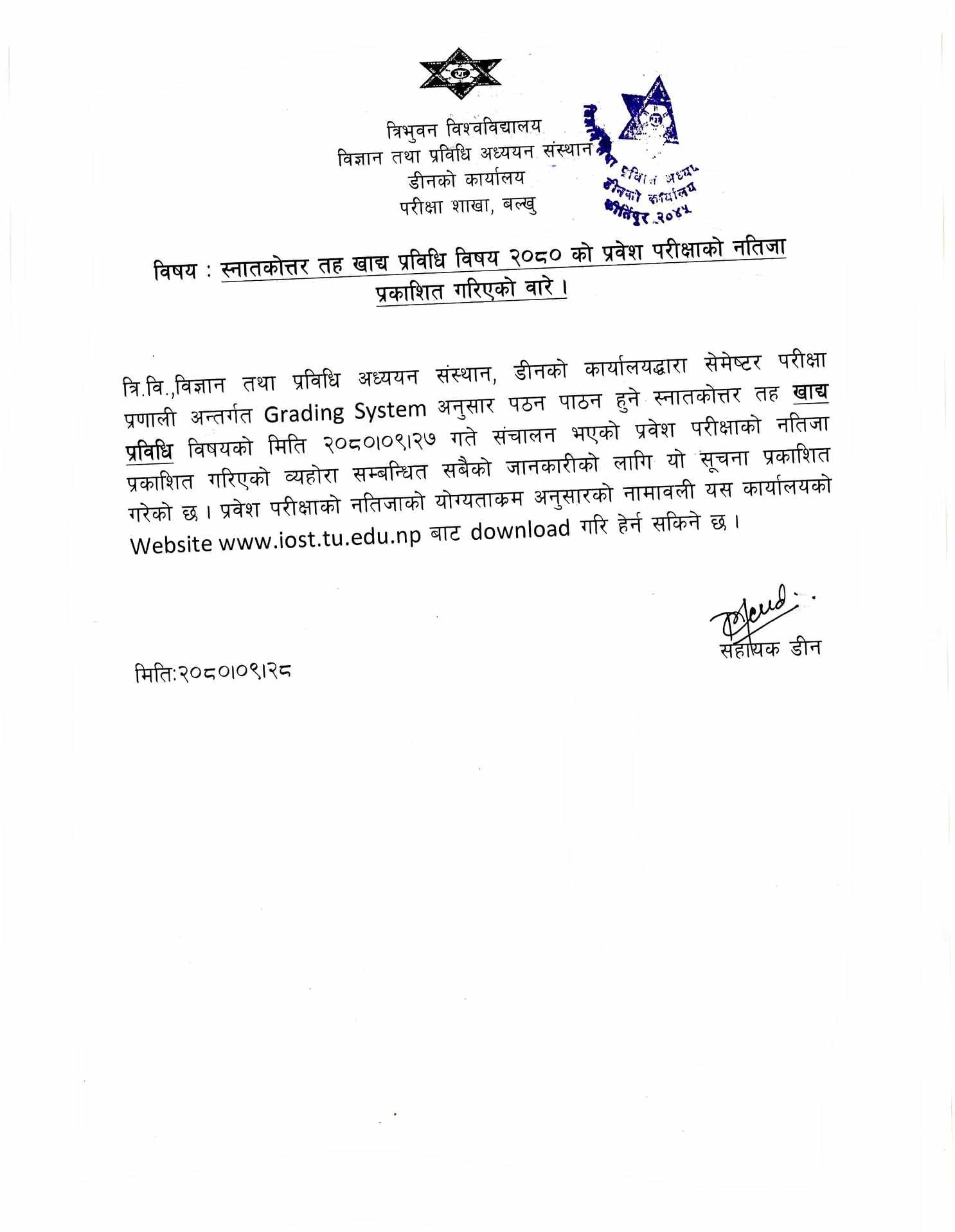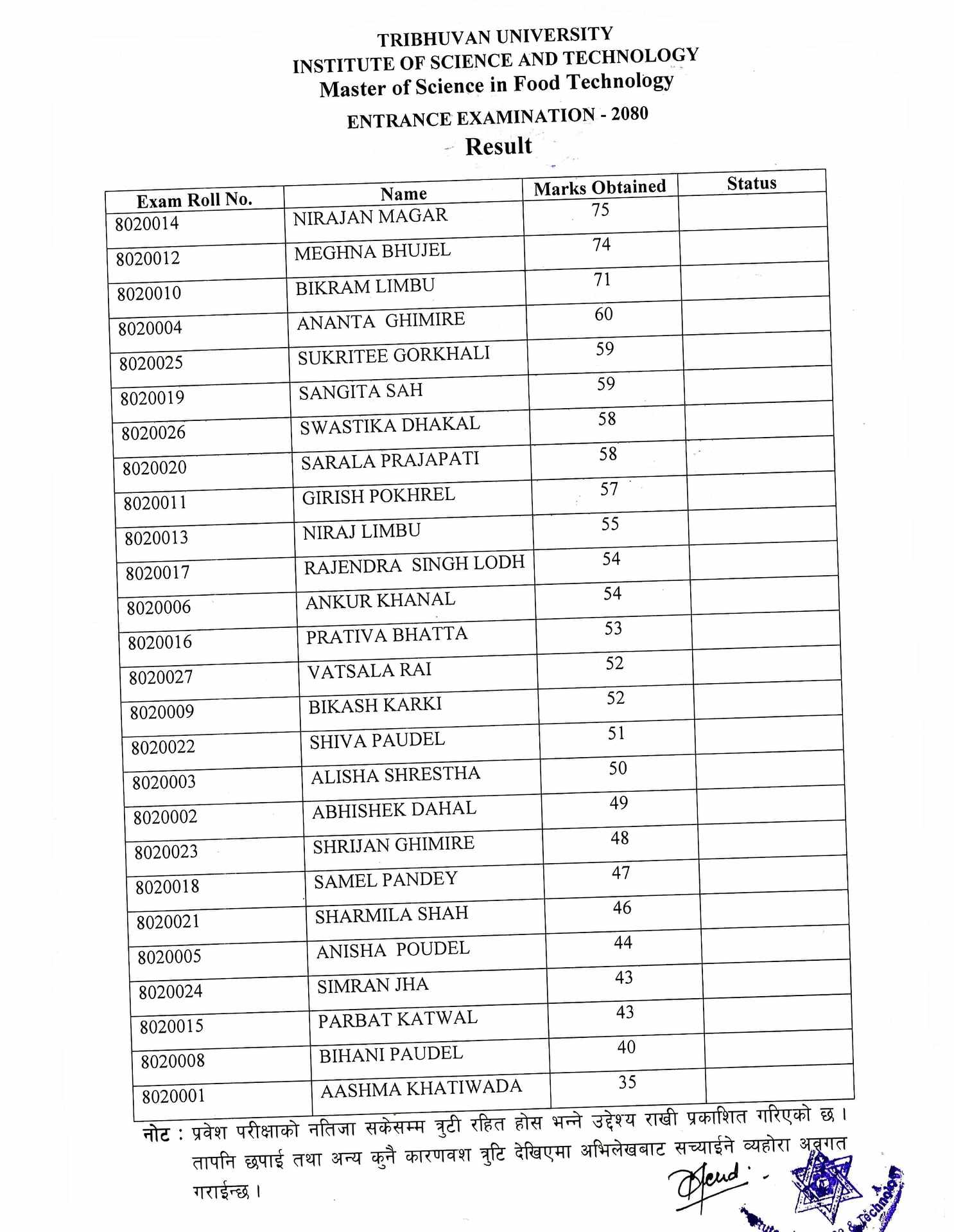 M. Tech. Entrance Exam Result 2080